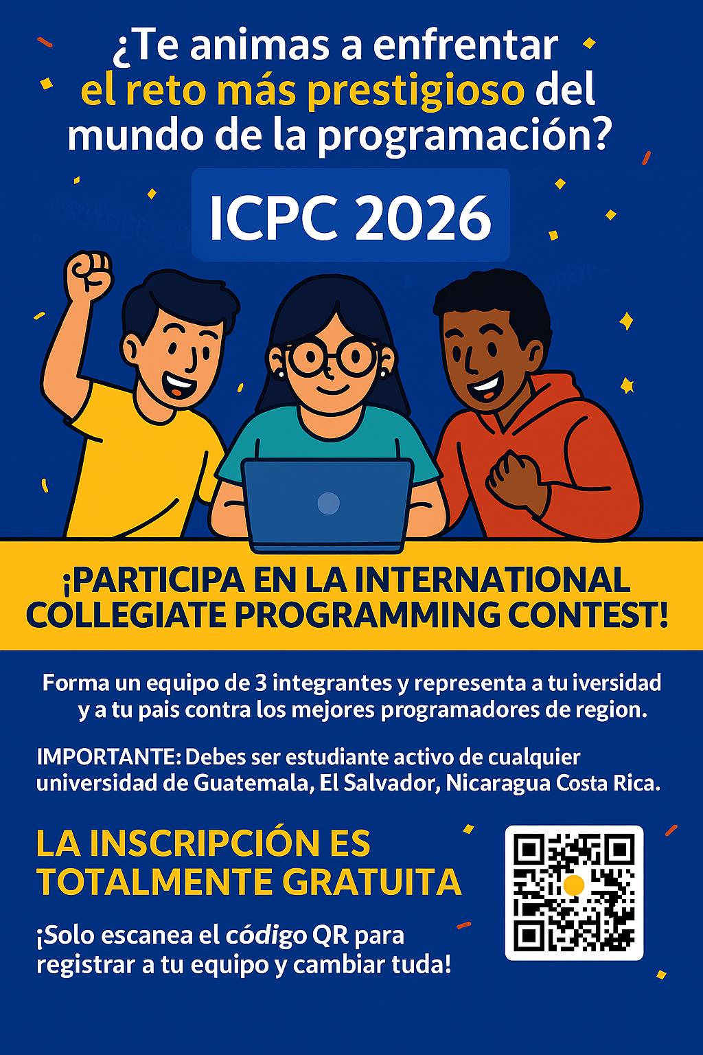 La competencia de programación más prestigiosa del planeta te está esperando. Si eres estudiante activo en cualquier universidad de Guatemala, El Salvador, Nicaragua o Costa Rica, esta es tu oportunidad de brillar. Si perteneces a otro país de Centroamérica, de igual forma puedes indicar una muestra de interés para que llevemos la competencia a tu país